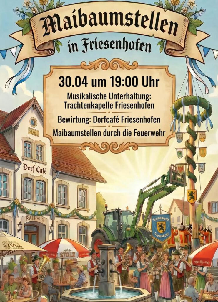Donnerstag, 30. April ab 19.00 Uhr Maibaumstellen mit der Freiwilligen Feuerwehr und der Trachtenkapelle